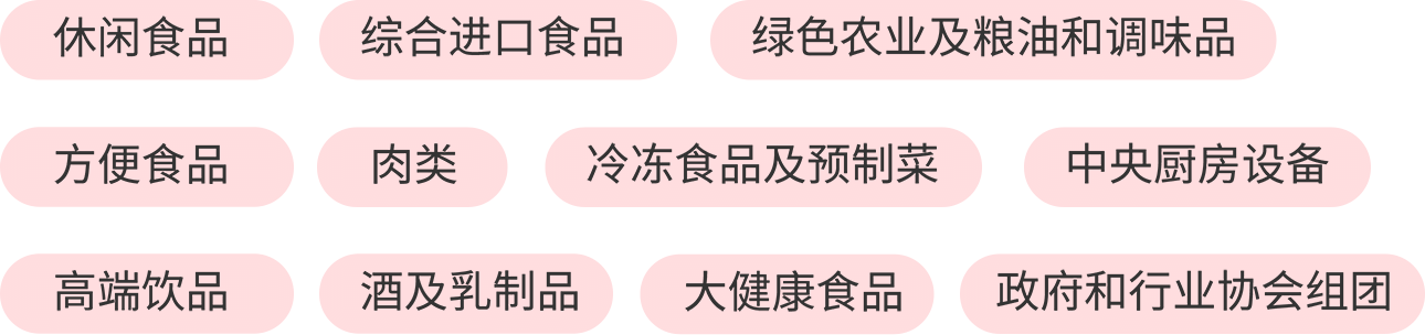 | 食品半成品、配料及原輔料,乳制品及蛋類,新鮮肉類,新鮮禽肉,新鮮水產(chǎn)品及半成品,果蔬及干果,觀賞型農(nóng)產(chǎn)品及種子、幼苗,零食、糖果、巧克力及烘焙類食品,腌制肉類,熟食及方便類食品,罐藏食品,寵物食品,冷凍食品,有機食品,大健康食品及兒童食品,糧油及調(diào)味品食品綜合,葡萄酒及烈酒其他酒精飲料,非酒精飲料,供應(yīng)鏈數(shù)字貿(mào)易,餐飲,相關(guān)設(shè)備、技術(shù)及來料加工,相關(guān)服務(wù) |
