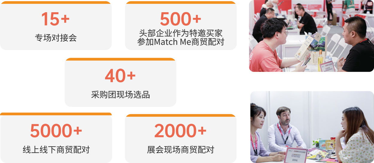 | 2023 SIAL 西雅展(深圳)為 600+ 展商和 500+ 特邀買家提供 Match Me 供需對(duì)接服務(wù),通過(guò)展位配對(duì)、團(tuán)長(zhǎng)選品區(qū)、大買家洽談間和對(duì)接會(huì)等多種形式為供需雙方成功搭建精準(zhǔn)、高效的貿(mào)易橋梁,現(xiàn)場(chǎng)共完成 5000+ 商貿(mào)配對(duì)場(chǎng)次。 |