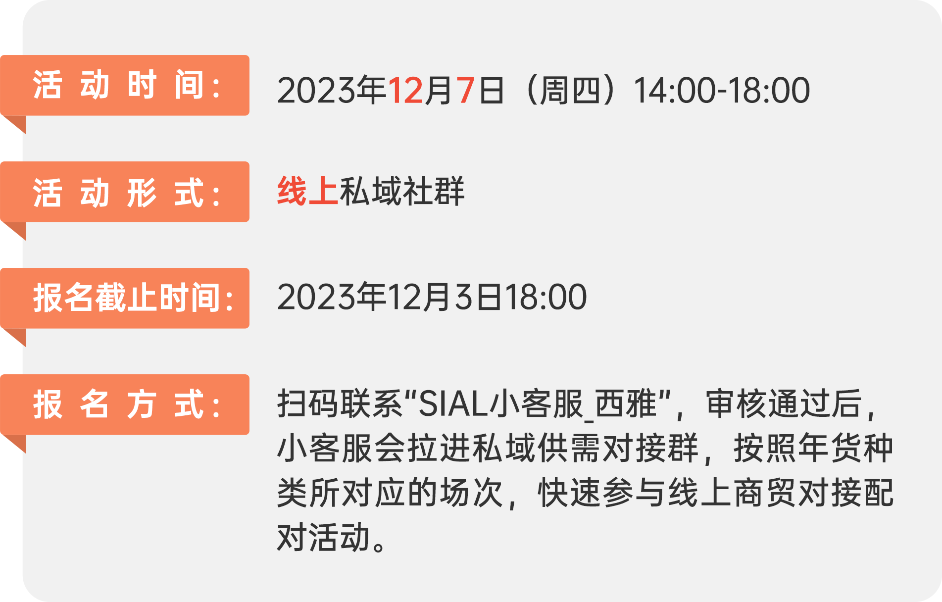 | 為了助力品牌商、經(jīng)銷(xiāo)商、商超等食飲全產(chǎn)業(yè)鏈打好年底最后也是最硬一場(chǎng)“戰(zhàn)役”,SIAL西雅國(guó)際食品展將于12月7日再次發(fā)起線上供需對(duì)接活動(dòng)“SIAL西雅展秋冬食飲采購(gòu)節(jié)”,以私域流量為食飲行業(yè)供需雙方實(shí)現(xiàn)年底完美收官再添助力。 |