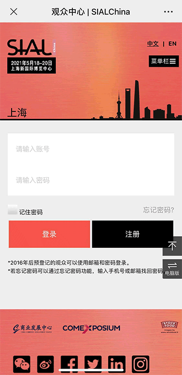 1. 進入預登記頁面:點擊上方“參觀申請”按鈕進入預登記頁面 2. 開始注冊/登錄: ① 2016年后通過預登記系統(tǒng)參觀過SIAL China:使用往屆郵箱和密碼“登錄”。 ② 首次進行預登記或2016年以前申請過預登記:選擇“注冊”,開始填寫信息。 |